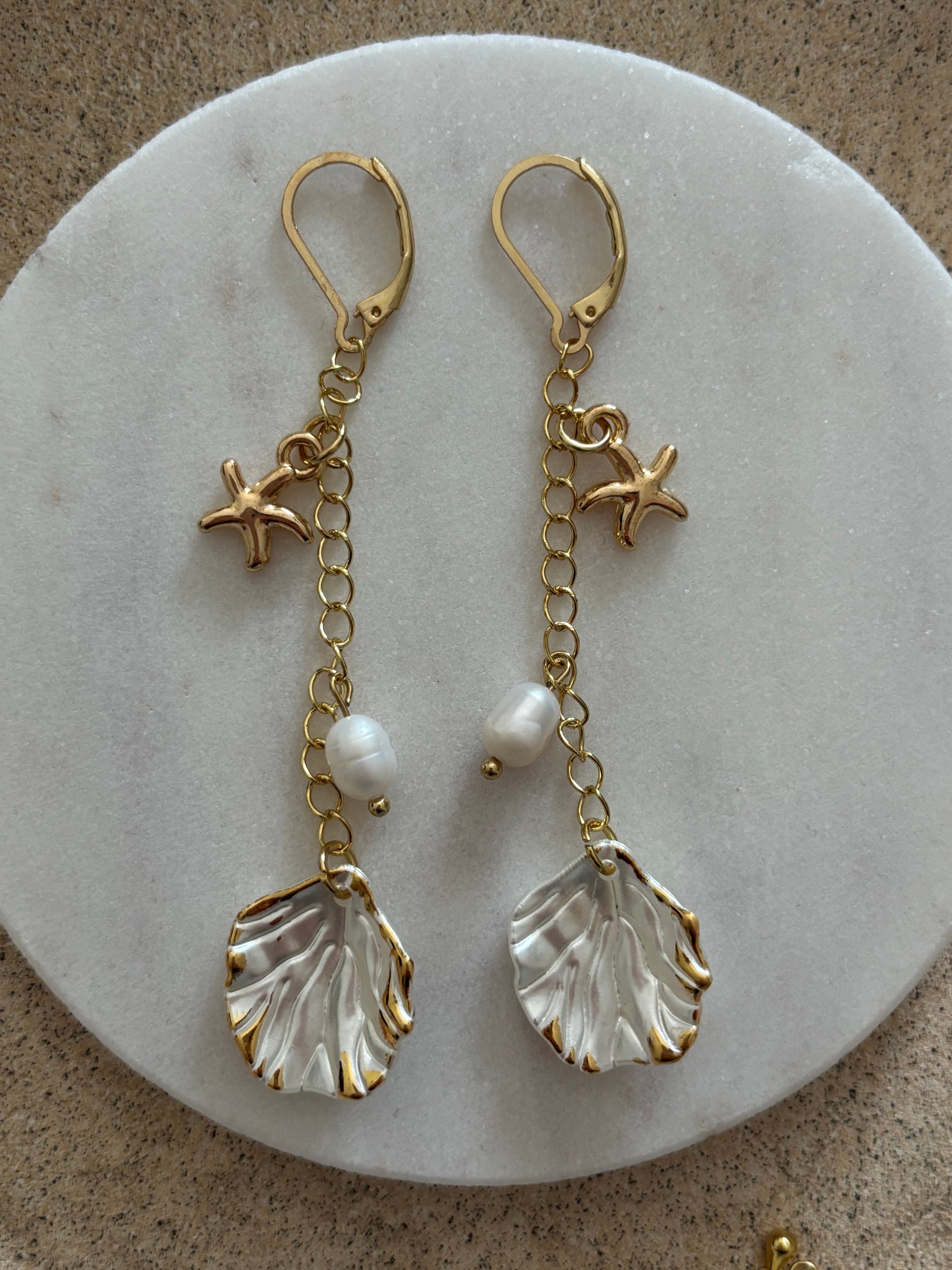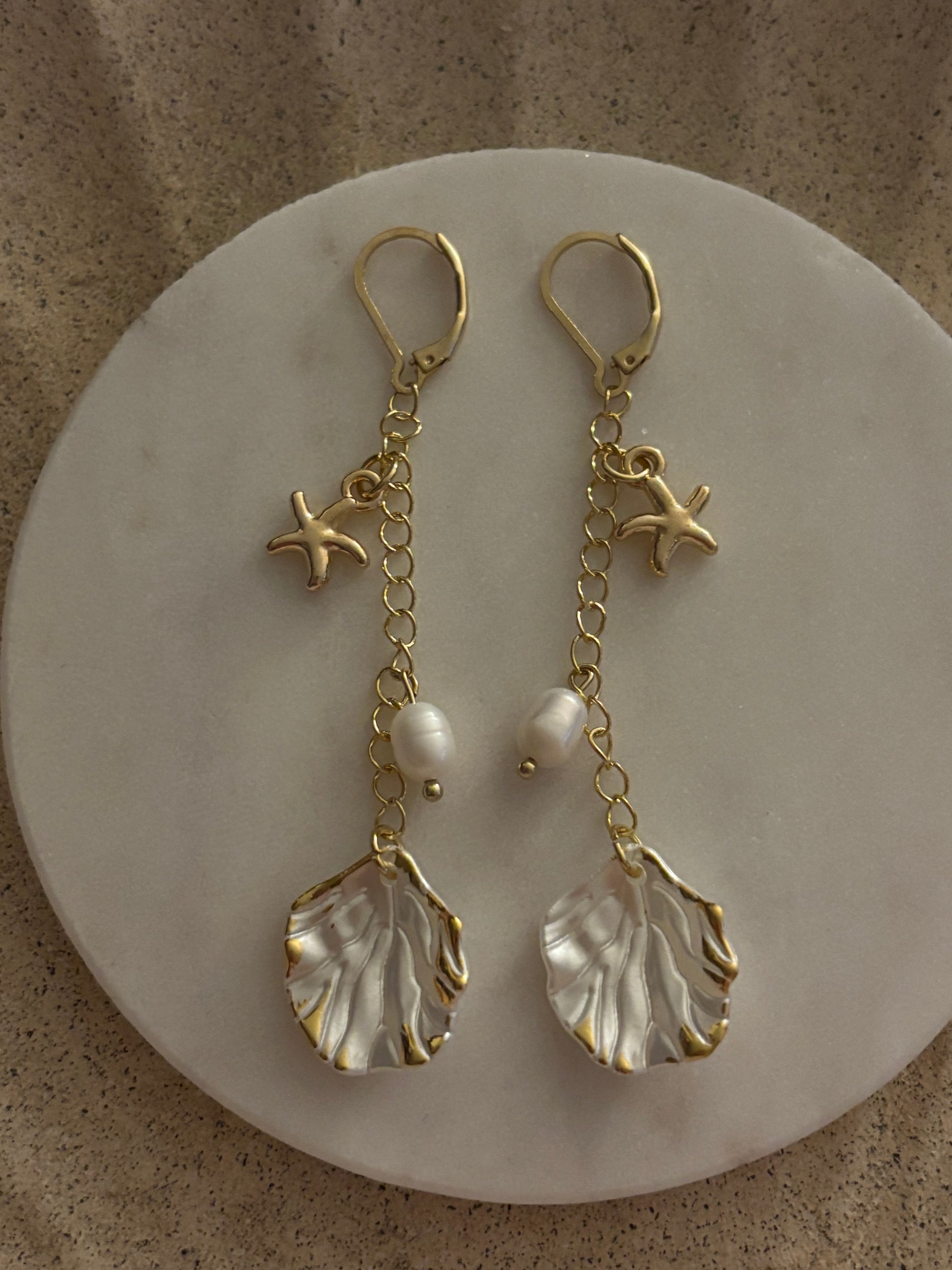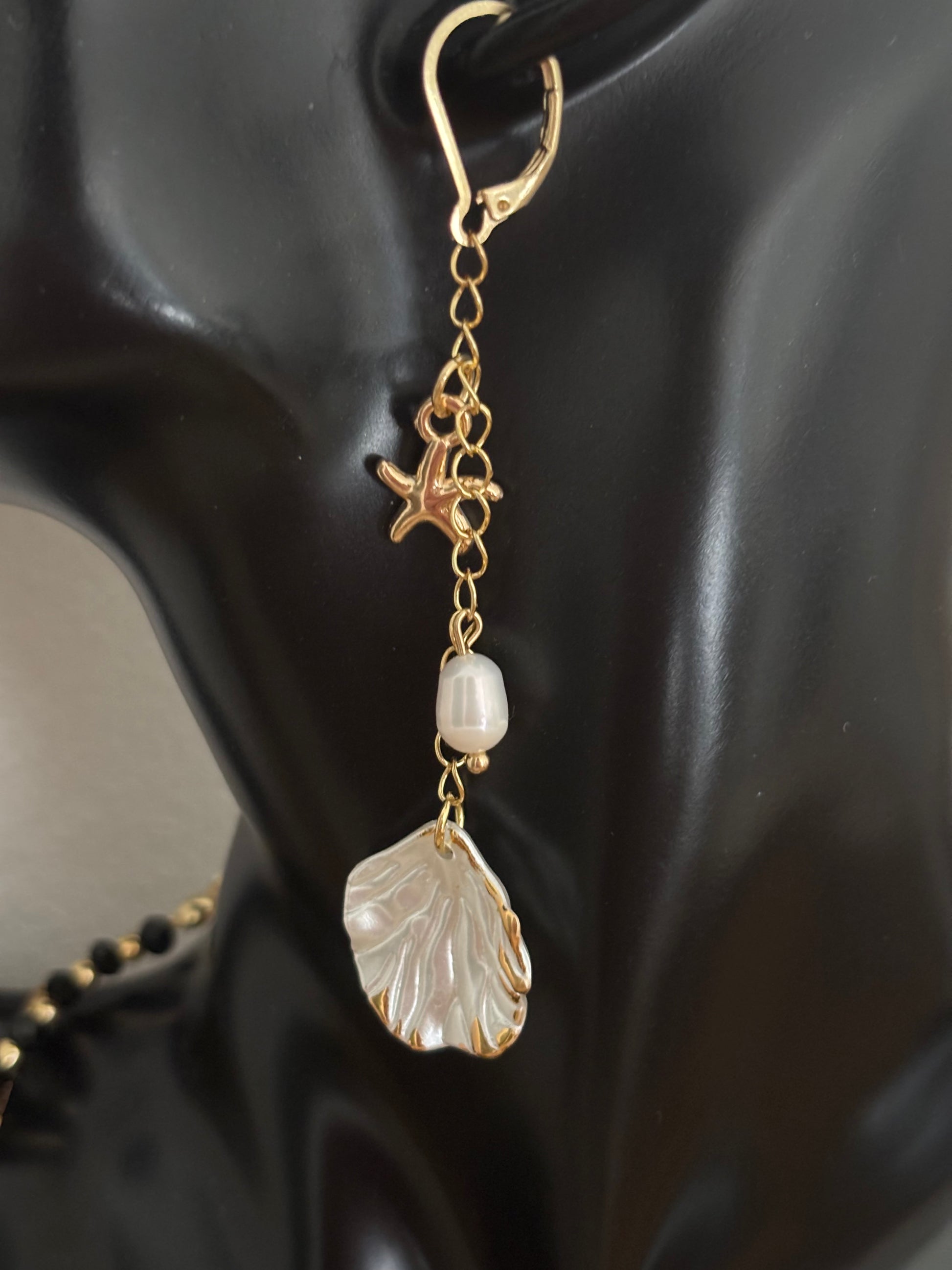 18 Karat vergoldete Lange Muschel-Ohrringe mit Süßwasserperle & Seestern „Ocean“