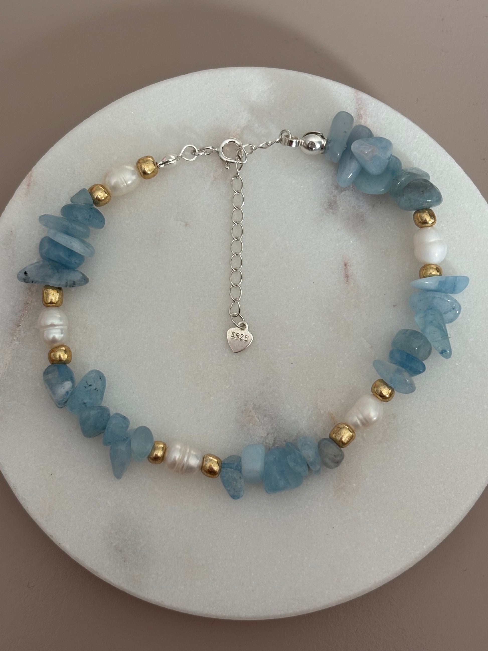 Dieses handgefertigte Armband kombiniert echte Aquamarin-Edelsteine, schimmernde Süßwasserperlen und edle vergoldete Details zu einem zeitlosen Lieblingsstück.