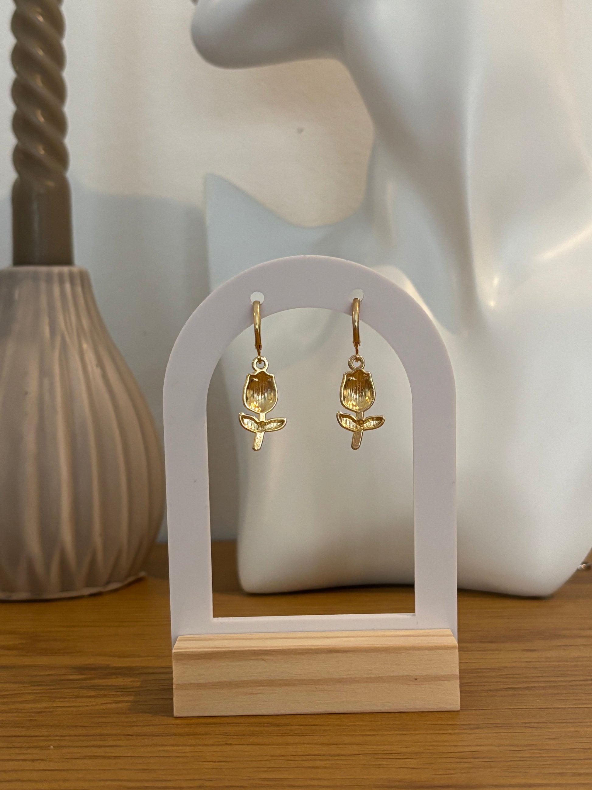 Zart, verspielt und einzigartig: Diese goldenen Klappcreolen tragen einen liebevoll gestalteten Tulpen-Anhänger in Violett und Grün. Die Kombination aus feiner Emaille und glänzendem Gold verleiht deinem Look einen frischen, femininen Akzent – perfekt für Frühling, Sommer oder romantische Looks.