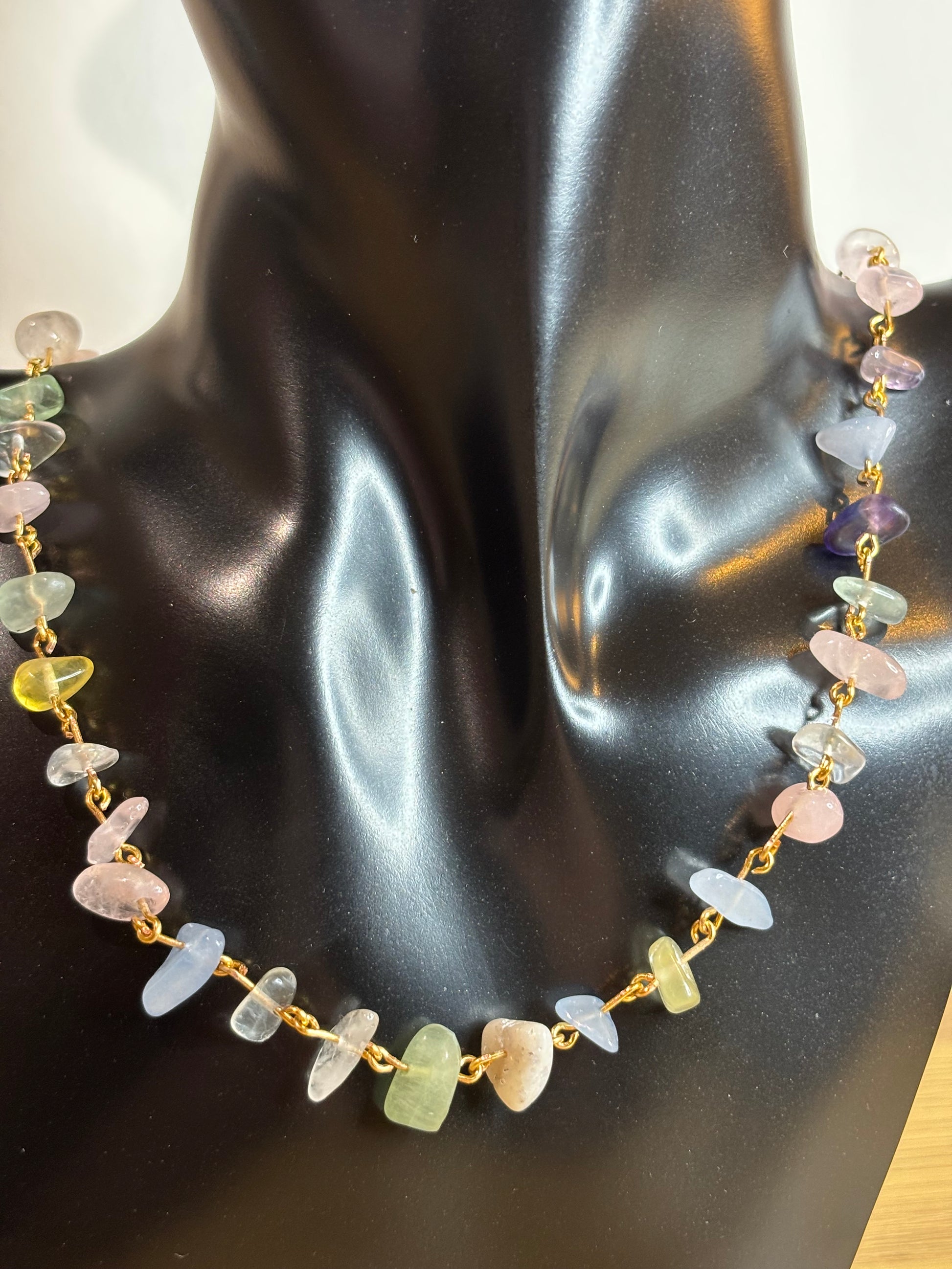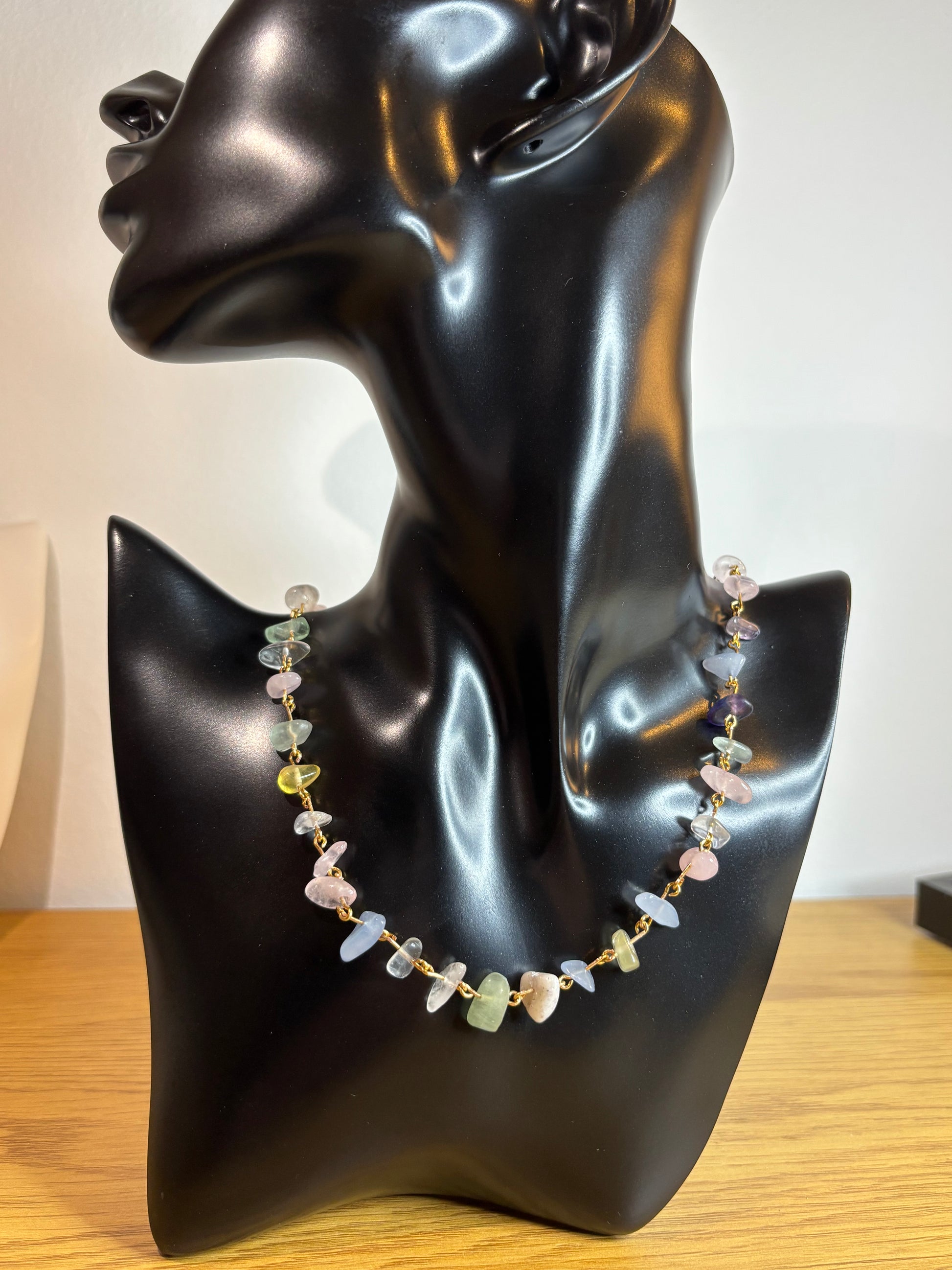 Diese filigrane Kette vereint echte Edelstein-Perlen in sanften Pastellfarben 💎 darunter Rosenquarz, Amethyst, Aquamarin, Aventurin und Fluorit. Jeder Stein ist ein Unikat, was jede Kette zu einem Einzelstück macht.